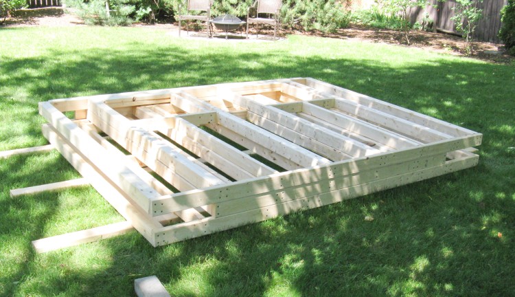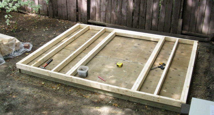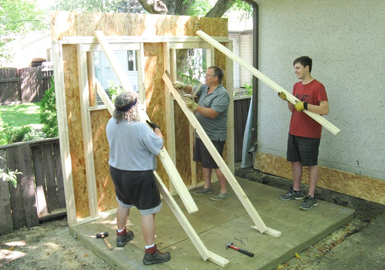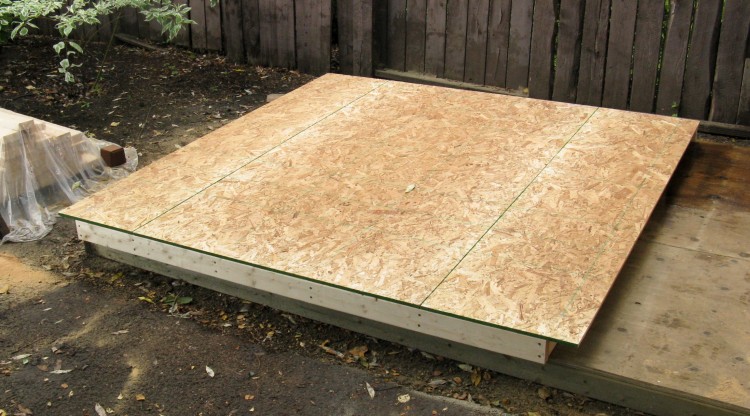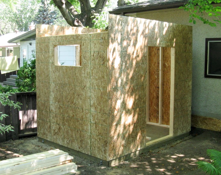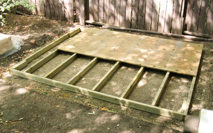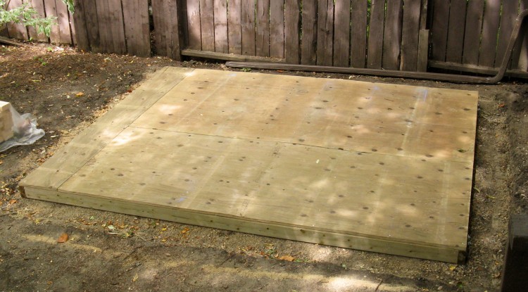 This photo shows the last of the above-mentioned steps; sheeting the front wall on top of the back wall on top of the shed floor.