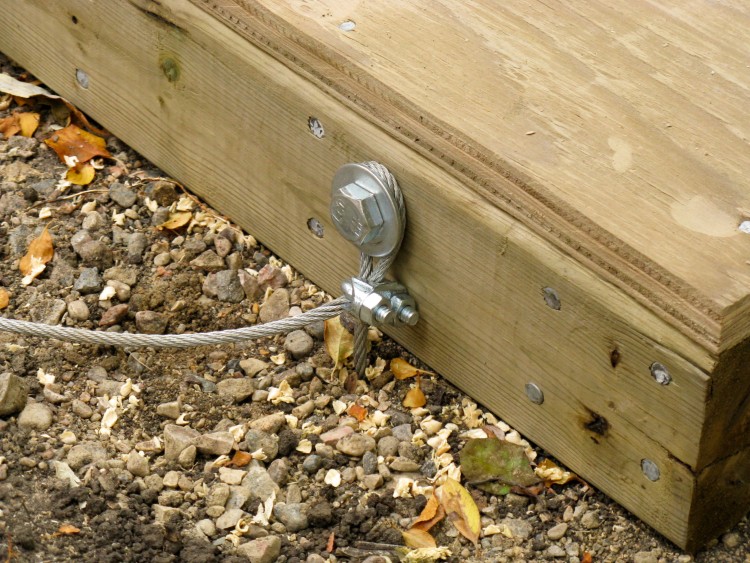 I used a large lag bolt in each of the reinforced sections at the corners to connect the ground-anchor cables to the base.