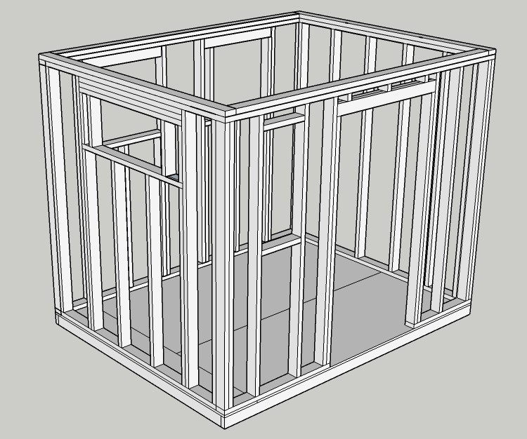 With the floor done, it was time to start thinking about the framing. In addition to the 2D plans, I had also made a 3D model of the framing. Now this wasn't necessarily particularly helpful, but was kind of fun to do and gave a nice overall look at the shed "skeleton".