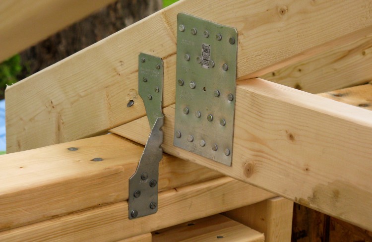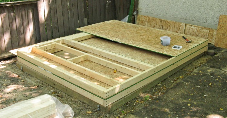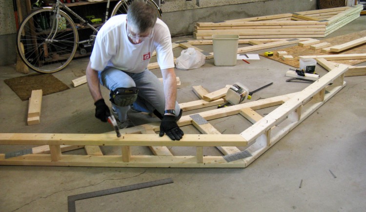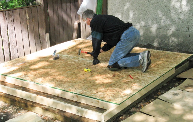 And then it was time to get the hammer out; I started on the floor, which was a standard frame with studs spaced at 16" and made from treated wood.