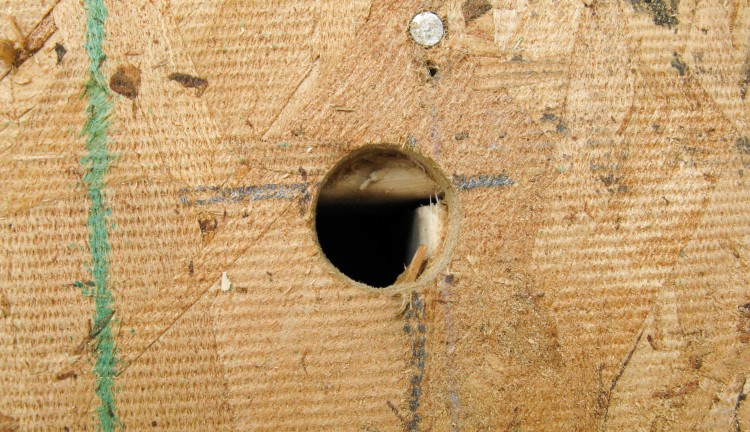 Instead what I did was measure and mark where the corners should be, and then used a 1" drill bit in that area to remove the OSB and find out exactly where they were. I was pretty accurate on this one, but others were not quite as close.