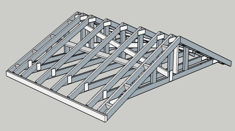 I did up a 3D model of the roof mostly to be sure I understood where the truss bracing pieces would go (those are the 2x4s tying the trusses together). The braces distribute the forces between the trusses and the walls and prevent buckling to ensure you get the full strength from the structure. It may not be too critical for a shed, but a few extra 2x4s are not a big deal.