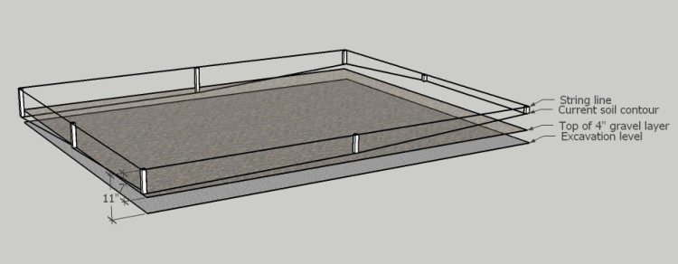 The bottom needed to be about 11" below the string line, and I used the string you can see stretched between the sides as a reference. I moved the string so it was over the area of interest and checked depth with a tape measure. The 8' x 10' excavated area gave 6" space to the edge of the shed all around.