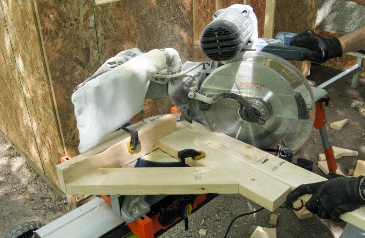 The cross pieces had a much "sharper" angle to cut. They needed to be 63.5 degrees from a 90 degree cut, but the saw doesn't move that far. So instead I made a right-angle jig and fed the wood straight in, which let me cut the crosspieces at the same saw setting as the top pieces.