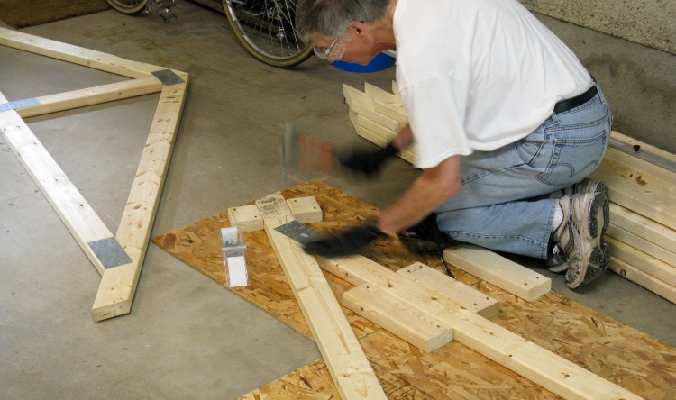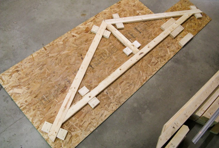 The trusses all need to be very similar to minimize roof dips and truss-end variation, so I made a jig to position the wood pieces accurately. It just consisted of an extended piece of OSB with 2x4 positioning guides nailed on.