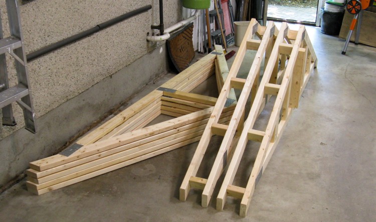 The next stage was doing the roof. I decided to use trusses as opposed to building rafters directly on the shed. I used a simple style called a King truss and with my truss parameters of: "#1 or #2 spruce/pine/fir" wood, 9' span, 16" spacing and 2x4 truss construction, the strength came out to just about what you'd need based on snow load in my location.