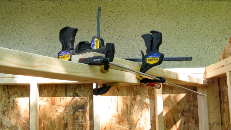 Unfortunately, the whole pallet of 3/4" plywood at the Co-Op was rather imperfect with a warped edge. I had hoped screws or nails to the joists would flatten them, but that didn't work. I ended up having to use clamps to force the plywood flush with the frame while I drove in long screws.