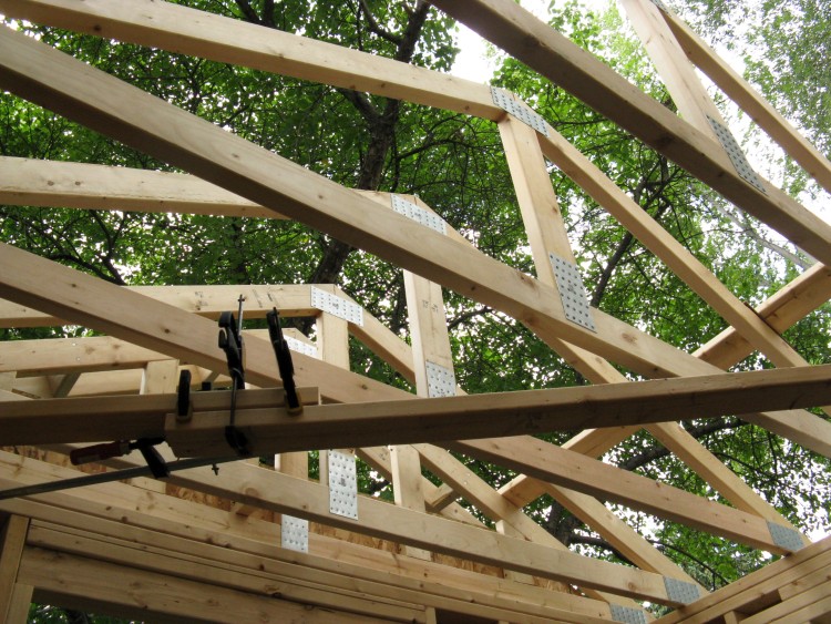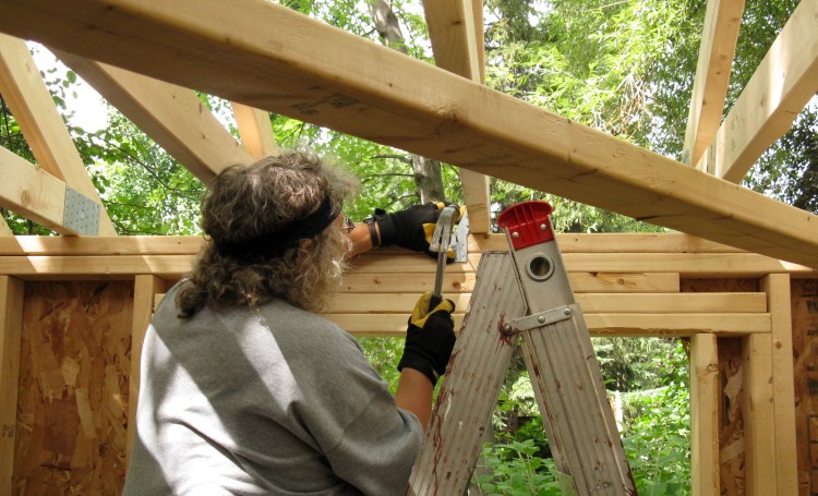 Here the four walls are up and attached. They weren't too far off vertical or square so they didn't need much adjustment. However, in the fine tradition of precision frame construction, things were tweaked to be a bit better by the judicious application of a sledge hammer in the appropriate corners.