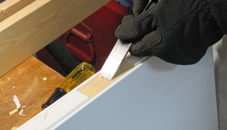Then using a chisel, the mortises were expanded to accommodate the new hinges. The same was done on the edge of the door.