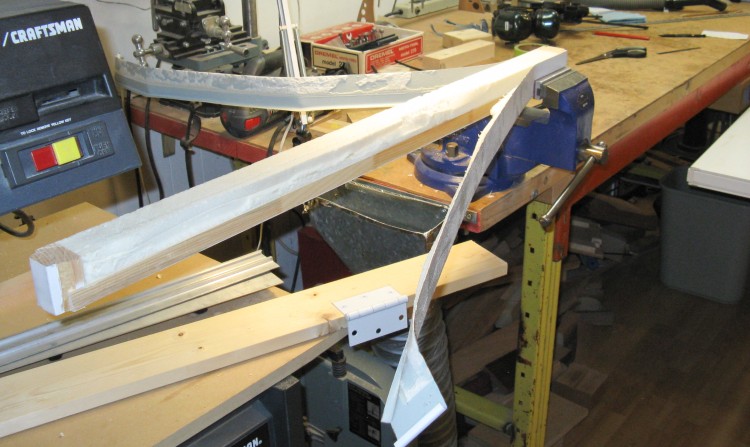 Once that was up I figured out how best to trim the fascia for unobtrusive joints, but before that could go up the 12' pieces of soffit needed to be cut up into little short sections, which was done mostly with the bandsaw.
