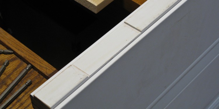 To bring them out a bit, I added an 0.3" frame made from the cutoffs of the door brickmould. These were glued on with a bead of sealant so that the joint would be waterproof.