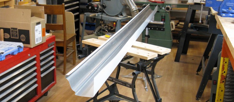 I selected aluminum eaves trough for the shed, and here I'm using "aviation snips" (AKA tin snips) to trim the length to match the eaves.