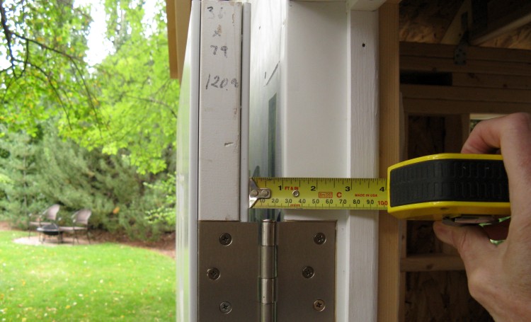 After the door was installed I started looking at the frame around it. I had bought some PVC brickmould which was a bit over an inch thick and found when I was fitting it that the door wasn't going to be able to open fully. The door would hit the moulding since the space between the wall and the door was only 0.5". Even the vinyl siding was going to be around 0.9" thick. Oops - that was a dimension I forgot to think about.