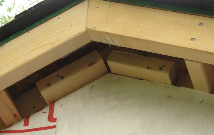 Then I could insert the soffit pieces into the J-channel attached to the shed and add the fascia cover. These were held on with nails, which were then covered up on the gables with some decorative "shingle mould", screwed in place.