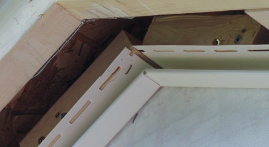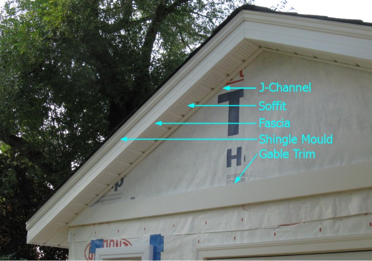 The soffit J-channel went up first just under the eaves, with the ends trimmed as necessary to mate at the side and top corners.