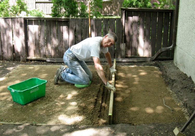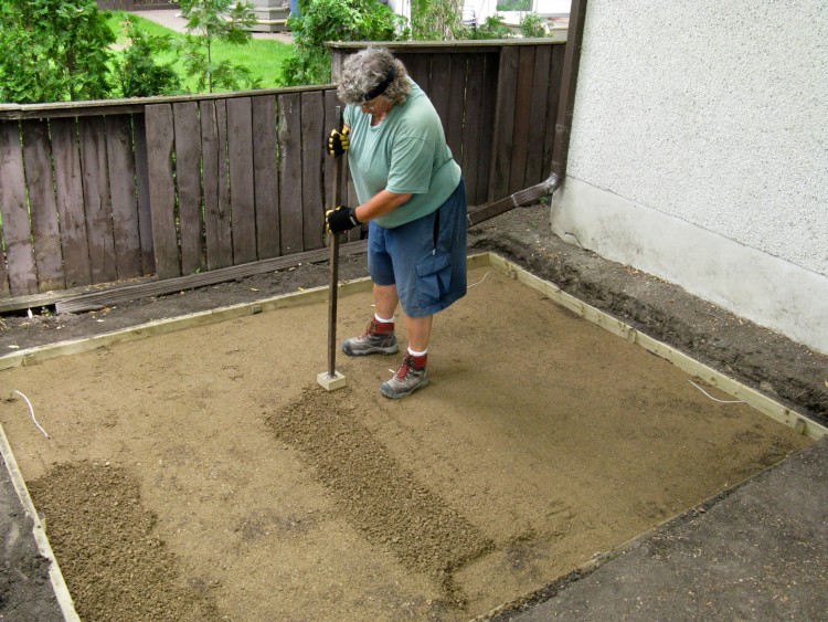 Here Sue finishes up the tamping for the first layer before we put the rest of the gravel in.
