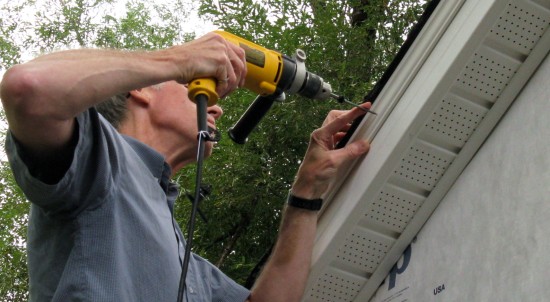 The eaves trough on other side wasn't quite as easy since there wasn't room for the drill between the shed and the garage wall, so the screws went in manually with a nut driver and a ratchet.