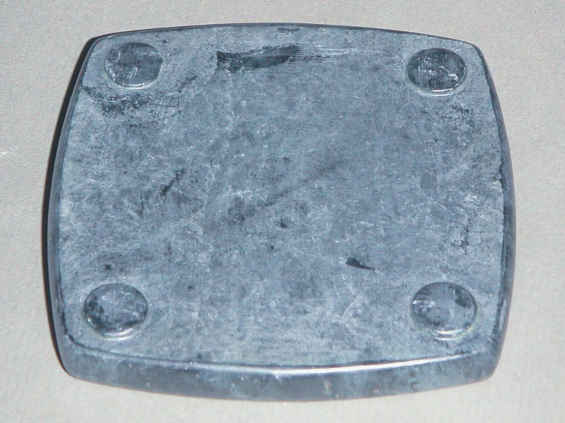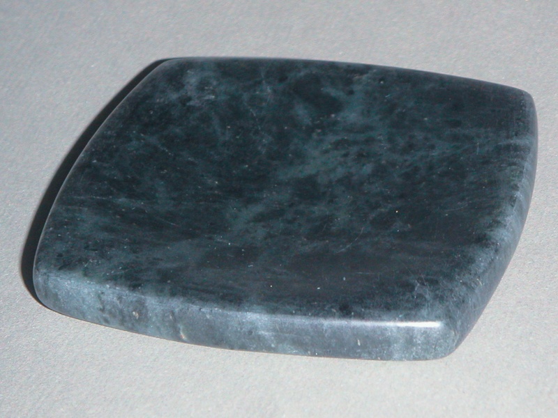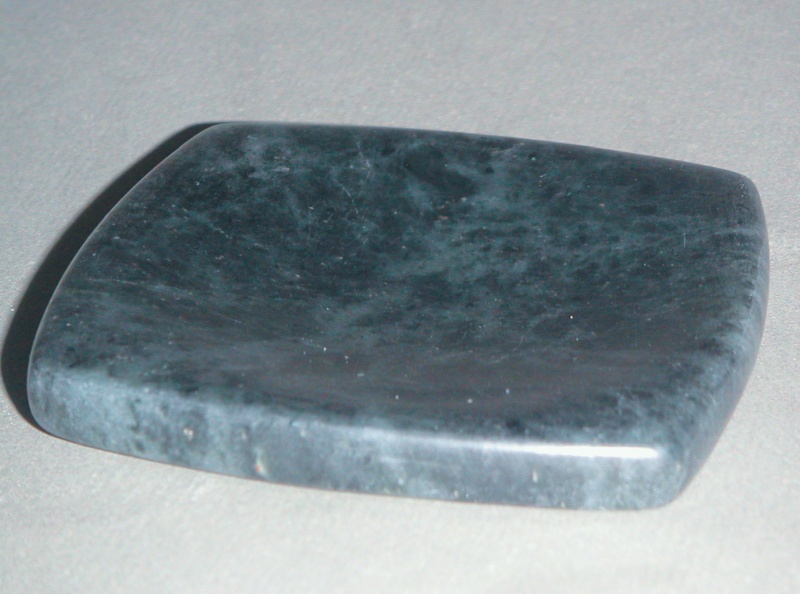 This is your standard kitchen spoon holder. It was made from soapstone, polished and then finished to seal it. I'm not sure why it seems better to put a messy spoon on a spoon holder rather than the countertop which inevitable gets messy and needs to be cleaned anyway, but it does. The bottom view shows the greyish colour of the raw stone - it looks substantially different after polishing (for which I used fine steel wool). The stone used in the holder is actually semi-transparent; you can see veining in the stone if you hold it up to the light. But mostly I just put messy spoons on it.