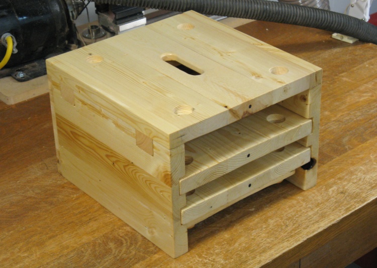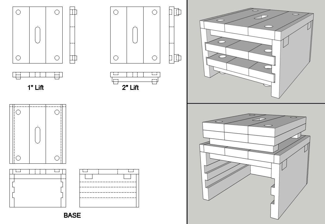 There are three pieces to be made; the base and two "lifts". They will all have hand holes (or more specifically, slots) to make them easier to pick up.