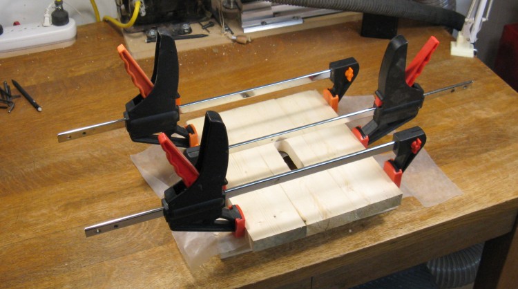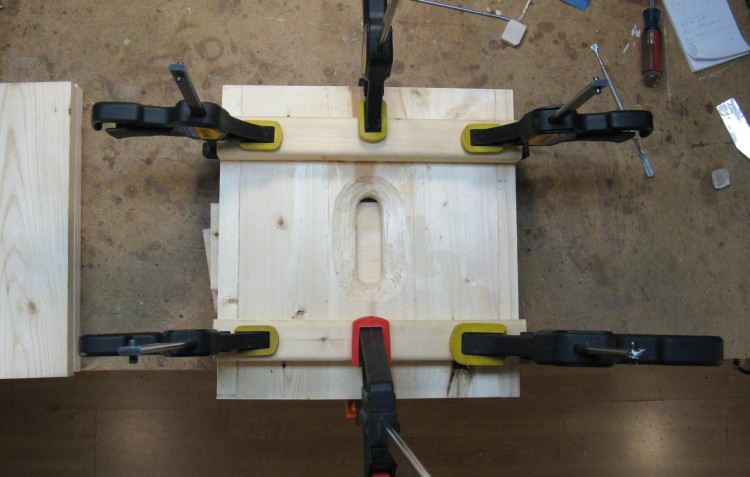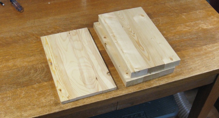 One of the handle-slotted pieces along with two normal pieces were laminated together to form a top, of which three were made. This particular one is for the base, and it later had some additional narrow slats added since it needed to be a bit wider than the two lifts.