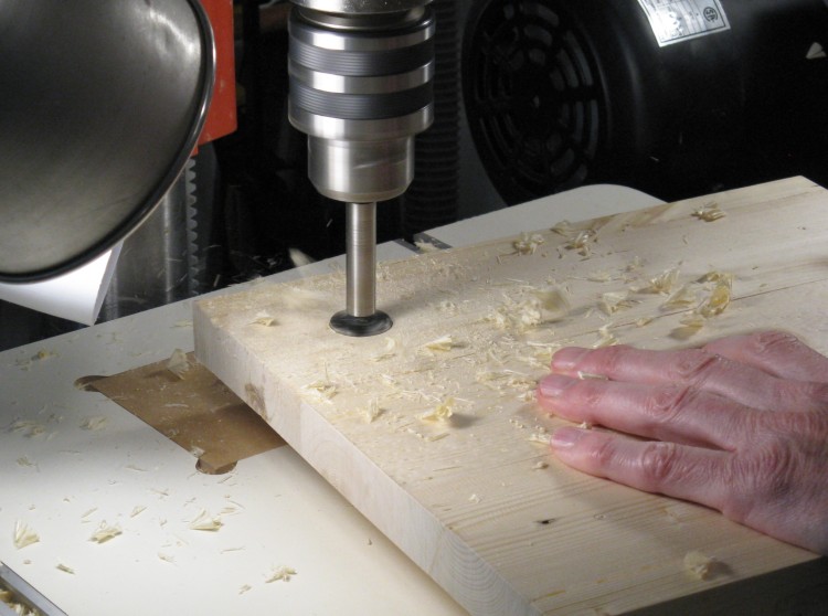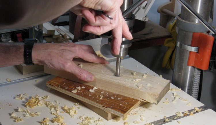 This photo shows a hole being drilled in the 1" lift. To allow room for imperfect peg positioning, the hole diameters were later expanded by about 1/16" using a sanding drum.
