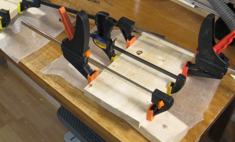 With 1"-thick wood, the 1" lift was fine as it was but the 2" lift needed another inch added. This was done with a couple cross pieces of 1" thickness. The same was done to the top of the base just for reinforcement, and it is the base that is shown being glued in this shot.