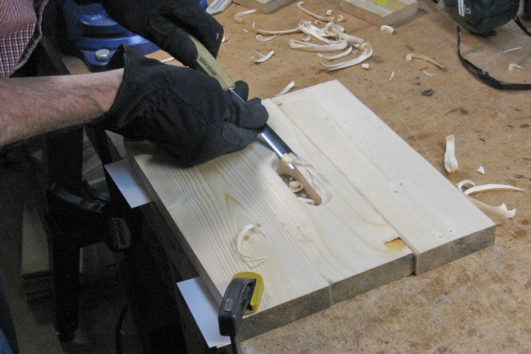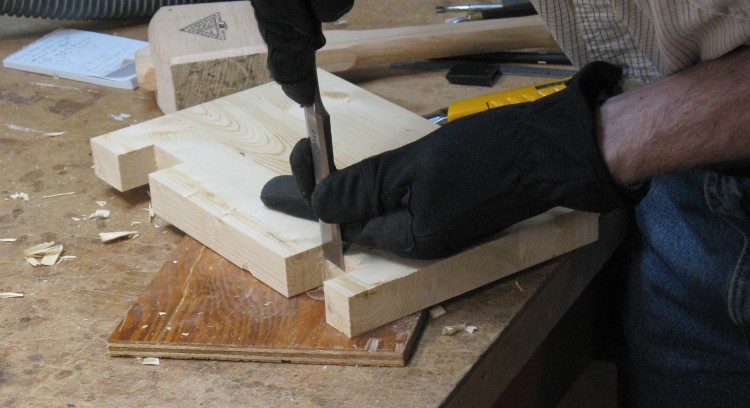 The sides needed to be contoured to fit around the supports for the top, so the bandsaw and chisel were used to form appropriately-sized notches.