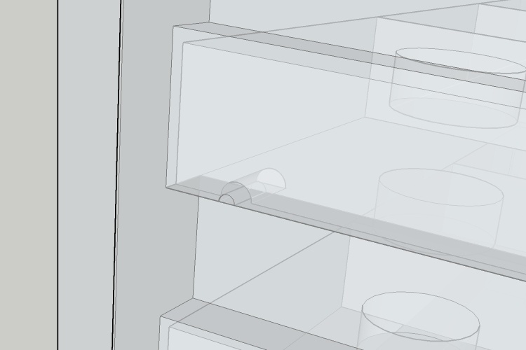 Since that's tough to photograph, here's how it looks in the 3D model. This is an "X-ray" view from the outside with half-dowels on the base and matching notches on the lifts to form the detents.