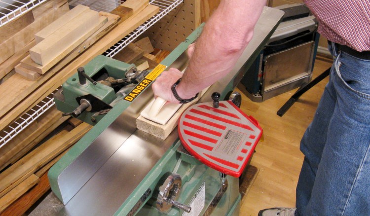 My plan called for the pieces to be reduced to 1" thickness, which also let me get rid of the rounded corners. The first step was using the jointer to flatten one side.