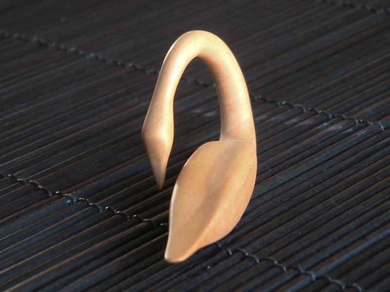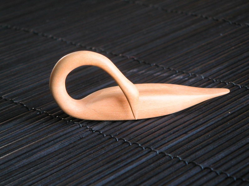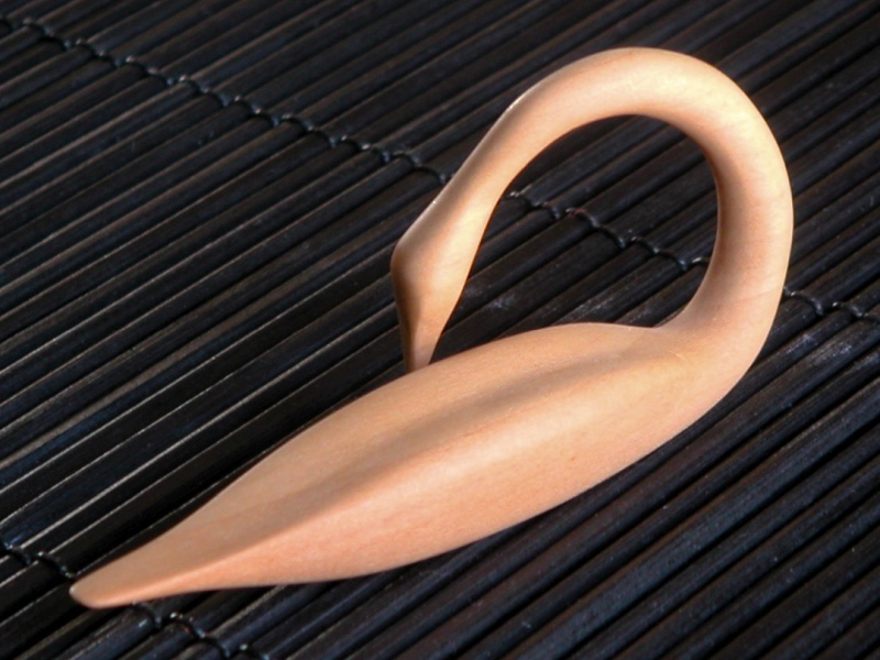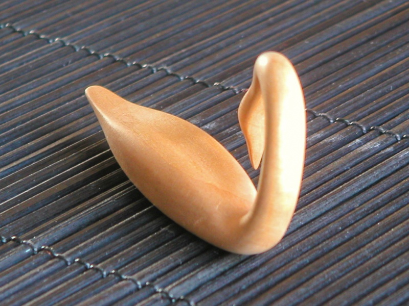 This carving was a copy based on a magazine photo of a stylized swan. My mother had pointed it out to me at one time since she thought it was nice. It was a pretty simple design, so I carved a small version for her. The design is kind of minimalist, which appealed to me, and it all kind of blends together. It is carved from Swiss Pear, which has quite a subtle grain. However, while this wood could be sanded to a fine finish, it was very difficult to remove the sanding marks. I have seen this effect in African Mahogany as well, where it needs much more sanding time than most other woods to get an unblemished surface.