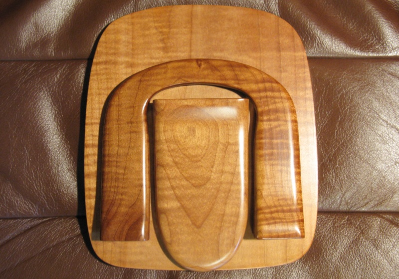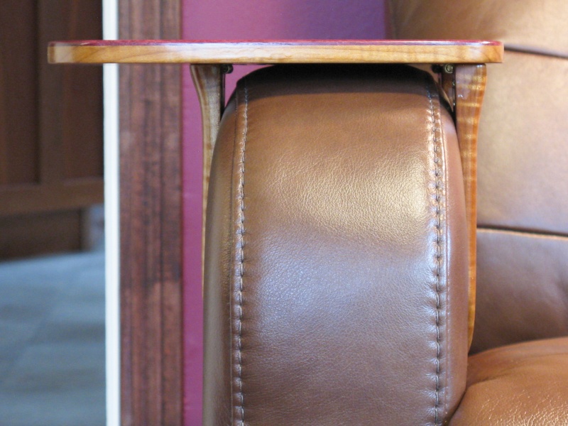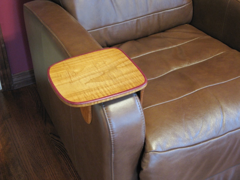 I have a reading chair in the sunroom which is positioned to the left of a small table. Being right-handed I thought it would be more convenient to have a table on that side, but the room layout prevents a table there. As an alternative I made this chair-arm table which sits on the right-side arm and is big enough to hold a coffee and maybe a modest snack.