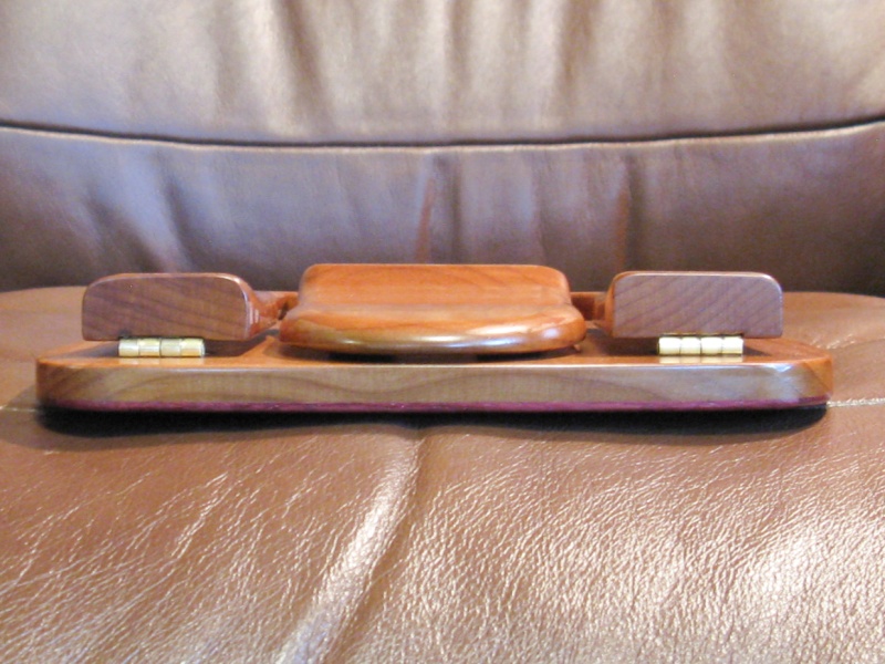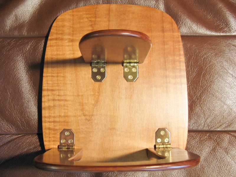 I had seen a similar, commercially-purchased table at a friend's place so that was the inspiration for this one. The commercial unit was a fixed design which requires a rather large storage space for when it isn't in use, so as a refinement this one was made to fold up for compact storage. The table "legs" hinge out and fit on either side of the chair arm, squeezing it slightly to hold the table in place. When folded, the narrower leg folds into the opening on the wider leg to minimize the folded thickness. There are some construction details