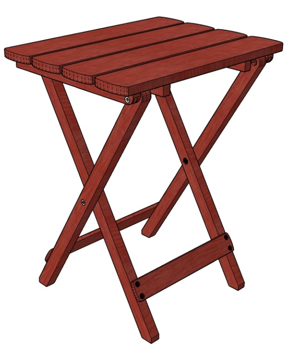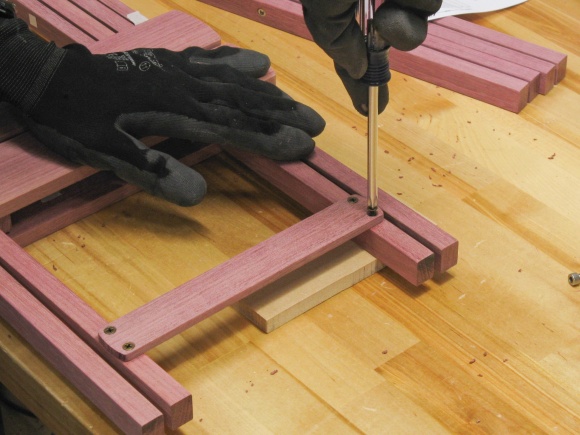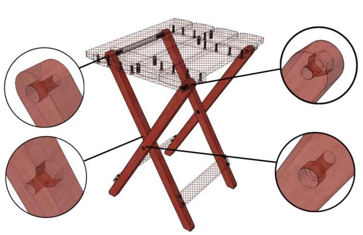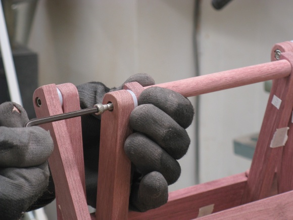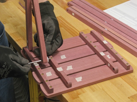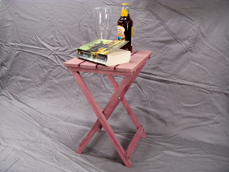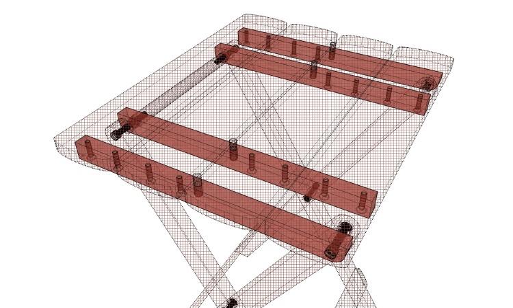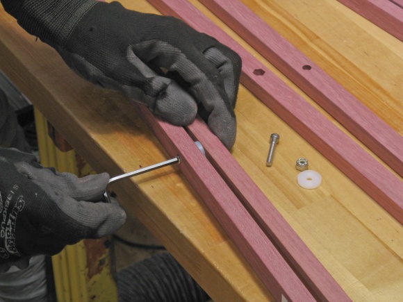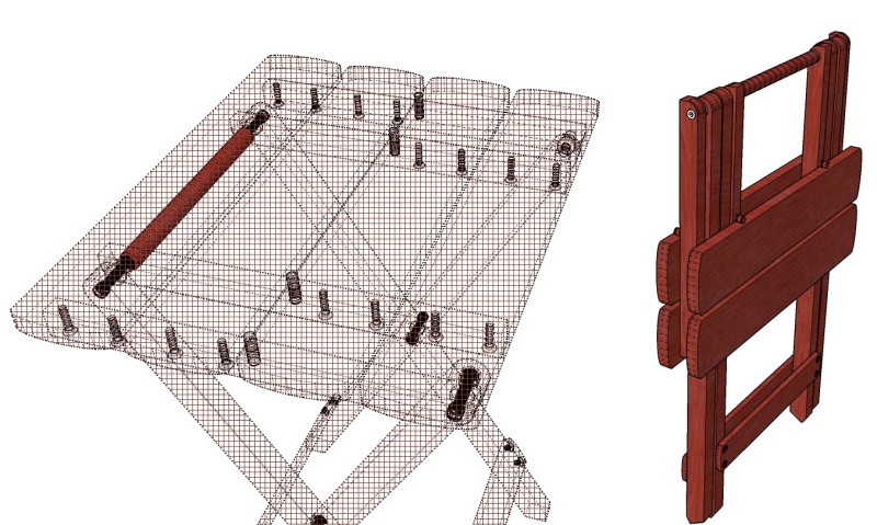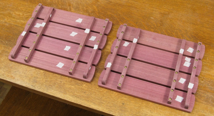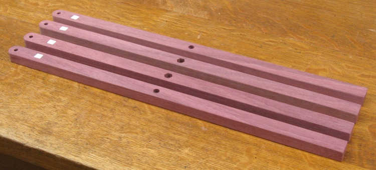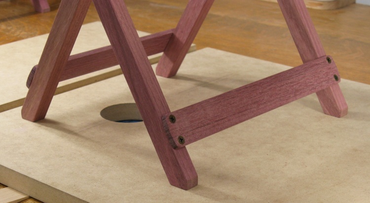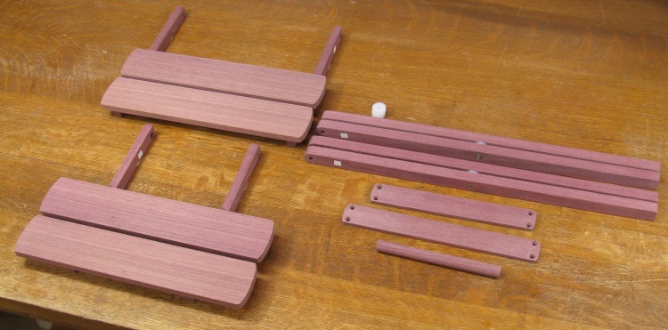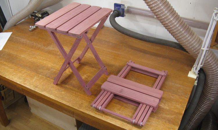 The purpleheart is a pretty good fit to this type of table; the wood is strong and straight-grained which works well with the linear shape of most of the pieces. The original mostly used rivets for the hinged joints while the wood version uses stainless steel bolts.