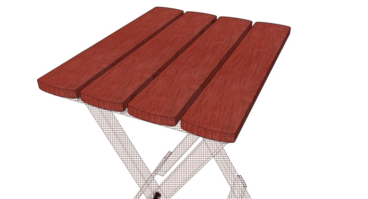 The table top is composed of two separate pieces which slide together with the planks of each half sitting on the joists of the other half. Spacing pegs positioned in the centers of the joists maintain the plank spacing between the table top halves.