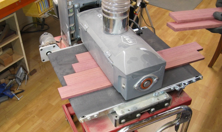 The raw top planks were run through the drum sander to clean up the faces and bring them down to the finished thickness of 11 mm.