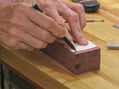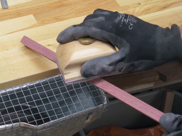 After sanding, the planks just needed the ends rounded. I made a couple of taped-together stacks so the ends could be done four at a time. The end curve is an ellipse 6 mm deep and since I needed to mark it a few times, I traced out and cut a business-card pattern to use. Then the ends were marked, cut on the bandsaw and sanded.