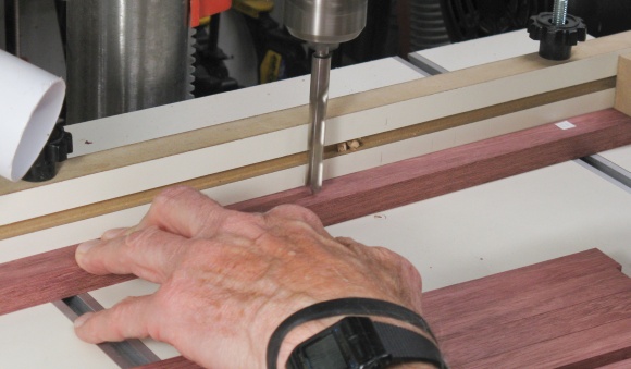 I had only Imperial drill bits so in the joists I drilled a 15/64" hole which at 5.95 mm was very slightly too small for the 6 mm pegs (well 6 mm +/- 0.1 mm). So I used an abrasive bit to slightly enlarge each of the holes until it fit a peg tightly.