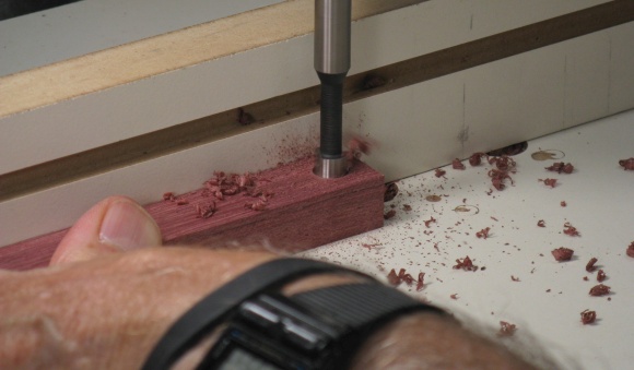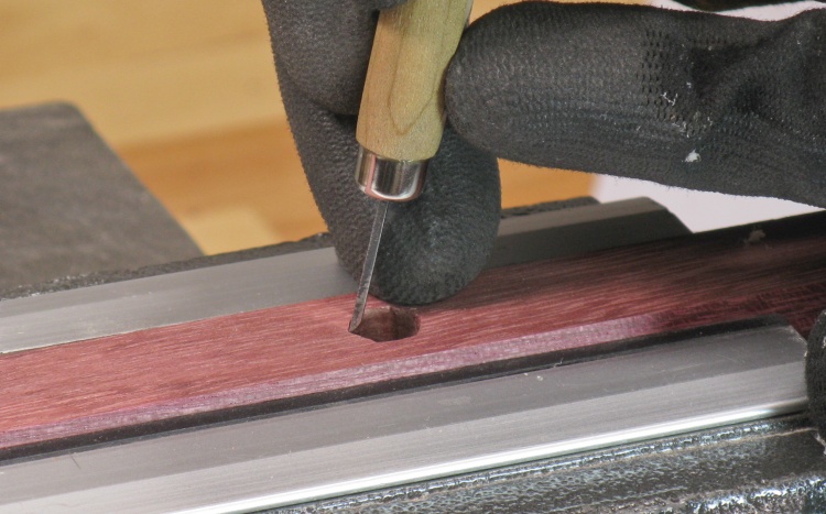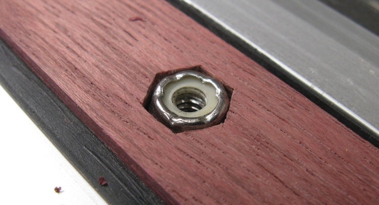 A hexagonal hole was going to be needed to embed the locknuts. The drilled hole was just a bit larger than the flats of the nut so then the 120° corners were formed using a small chisel.