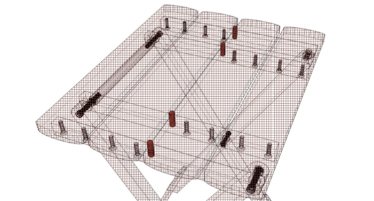 I started by assembling pairs of legs. As with all the joints, they have a #10 socket-head bolt, a plastic washer and a hex locknut. Following that, the legs were attached to the overlapped top assemblies.