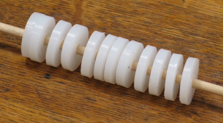 The washers are 3/4" diameter and 3 mm thick (sorry about the unit clash) and I had some suitable polyethylene to use for them.
