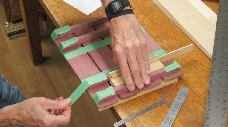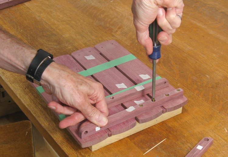 The top planks were first taped to a backing board with 6 mm spacers between them to provide proper plank separation. in this shot the joists have been positioned on top of the planks and I'm taping them down as well. The plan is to use the joist screw holes as a guide to drill pilot holes in the top planks.