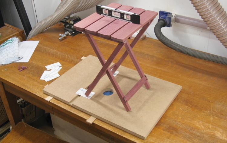 I started by using a flat sheet of wood as a base which I shimmed up to be level. Then I set the table on top and shimmed the legs until it was level as well.