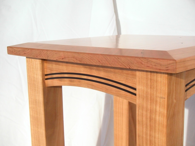 After unsuccessfully looking for a table for the foyer for some time, I decided to make one (yah, I'm pretty picky). In the past, we had a tiny foyer (about 5' square and no closet) and we used to come in and put things down on a stereo speaker, which was just outside the foyer in the living room. The speaker is a fairly large floor-standing unit about 36" high, and was pretty convenient as a drop-off point. For this reason, I decided to base the table height on that of the speaker. We also have an arts-and-crafts style dining room table made from Cherry (bought, not home-made) and the foyer table was made with similar design features. Of course, you would need eyes like a chameleon's to see both the tables at the same time, but what the heck, I liked the design. The design features included the beveled top, square legs and black inlaid trim and feet. I made a few changes such as curving the trim and the skirt pieces, and giving the legs a curved taper instead of a straight taper as on the dining room table.