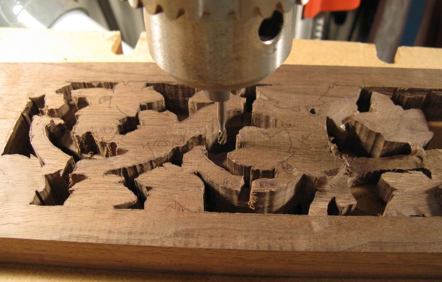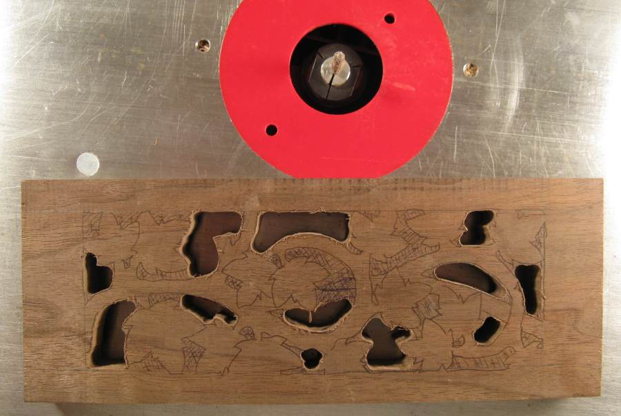Ultimately, though, this proved to be of limited usefulness since many of the sections to be cut out (designated by the scribbled-upon areas) were smaller than could easily be made with a rotating bit, as the picture above shows. The better technique was to use a jigsaw to cut out the through-hole sections.