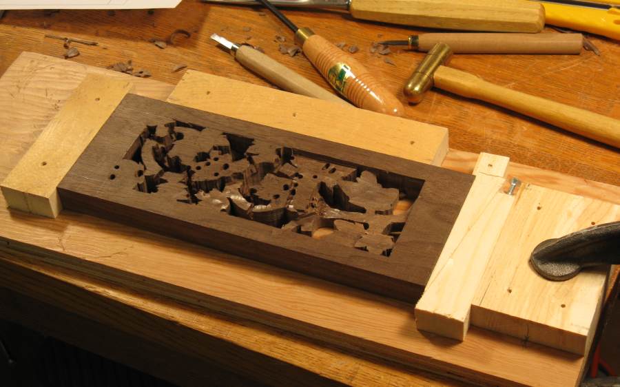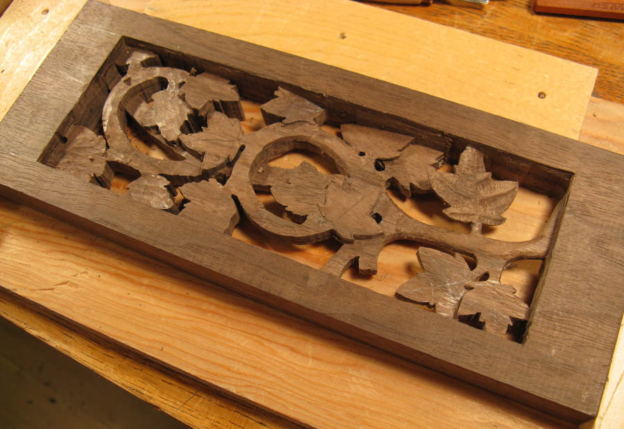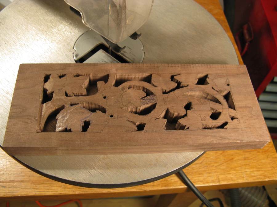 I started with the carved panel since that seemed like it would be the most involved piece. Since this was to be a pierced carving - holes from front to back - it was started by transferring an outline on the blank and drilling out sections that were to be open completely through.