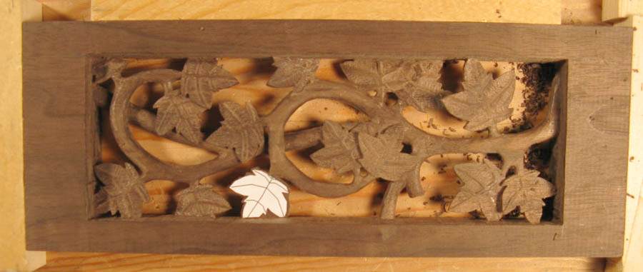 While developing the pattern, one goal was to avoid making the finished piece too fragile. That was accomplished by making sure that the leaves were well supported, so they either intersect the walls or rest on the vine. The shot below shows the almost-complete piece, with one leaf left to be sized. As can be seen, that was done by cutting the appropriate pattern out of paper and using it for final trimming of the leaf edges.