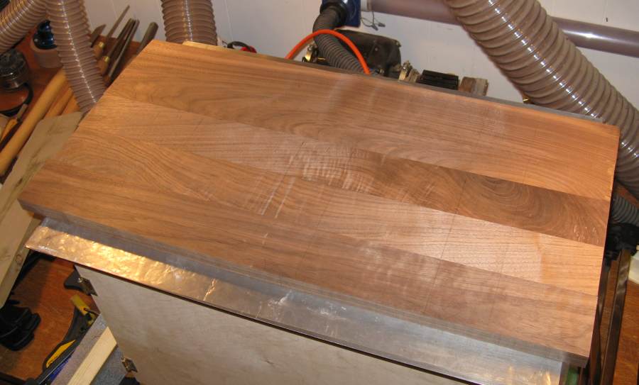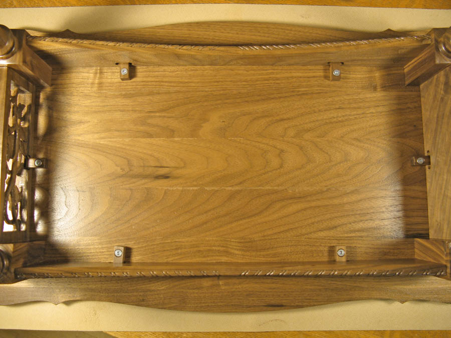 As mentioned on the main page, the attachment of the top is done with walnut clamps (sometimes called turnbuttons). These are little blocks that get screwed to the top. They each have a tongue that fits into a groove in the sides to clamp down the top. This permits a bit of movement for seasonal expansion and contraction. The top was drilled from the bottom side for the screws holding these clamps, but that was not done until after finishing.
