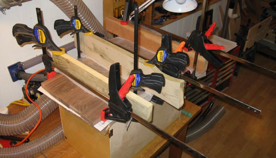 The five planks were glued up, assembled and clamped. The 1/4" steel cover of the router table, topped by a piece of 5/8" MDF provided a flat surface on which to clamp the planks. The use of the biscuits actually slows the application of glue significantly, so the process would have been less rushed by first assembling just three planks, and then adding the remaining two in a second session. As it was, the glue applied first was starting to set by the time the last glue was applied. This made for tougher clamping, since the glue was not lubricating the pieces as well as is customary.