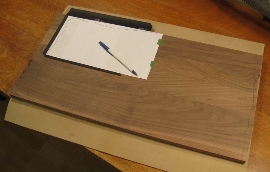 After assembly, any remaining glue residue was removed and the pieces evened out by sanding. The photo below shows the pattern being transferred to the top.