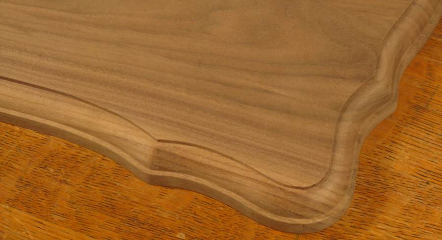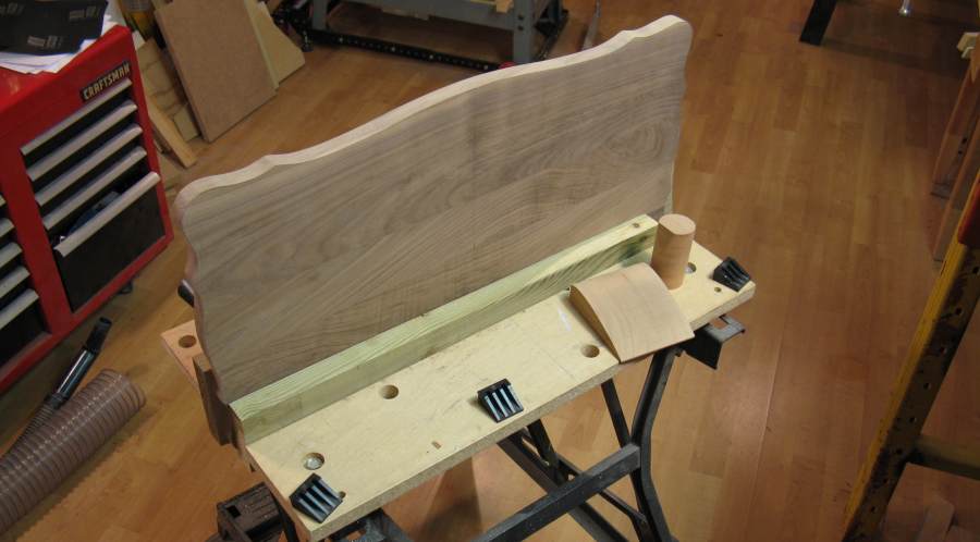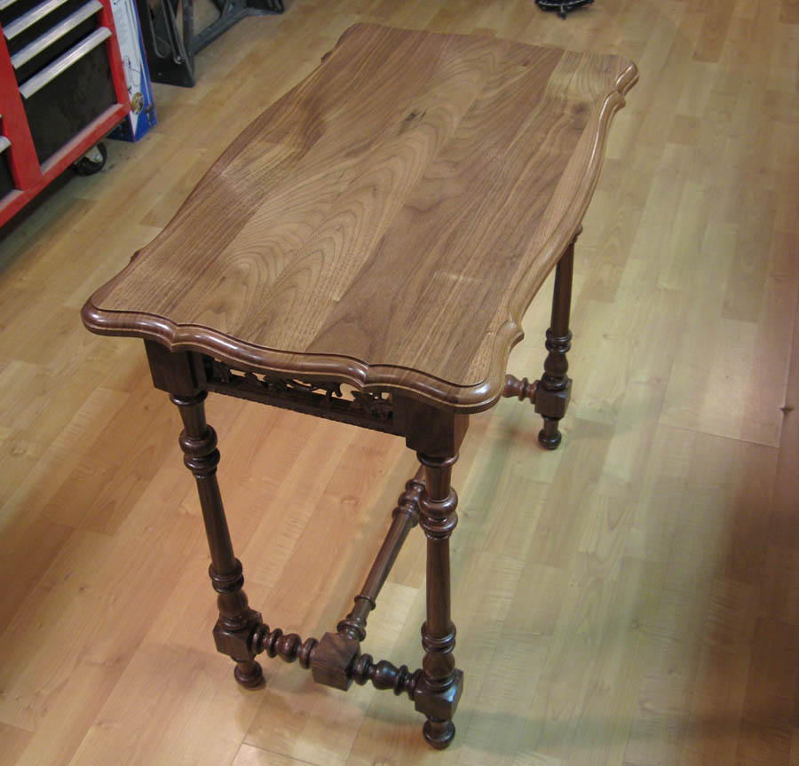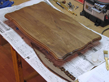 So it was back to the wood store for another couple boards of walnut, cut them into planks, square the edges, flatten the sides, plane to thickness, glue up into a complete top, sand smooth, mark for shape, cut out on the bandsaw, shape on the spindle sander, finish shaping by hand, route the decorative edge, and sand the edges.